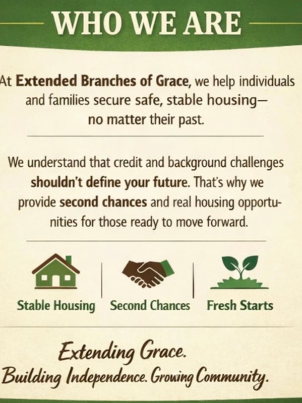 Extended Branches of Grace LLC is a housing company dedicated to providing affordable housing options for individuals and families that may encounter barriers with traditional rentals in Tallahassee, FL. Our mission is to create stable and affordable housing options that are accessible and sustainable for our clients. By offering affordable housing solutions, our focus is to make a positive impact on the community and improve the quality of life for those in need.